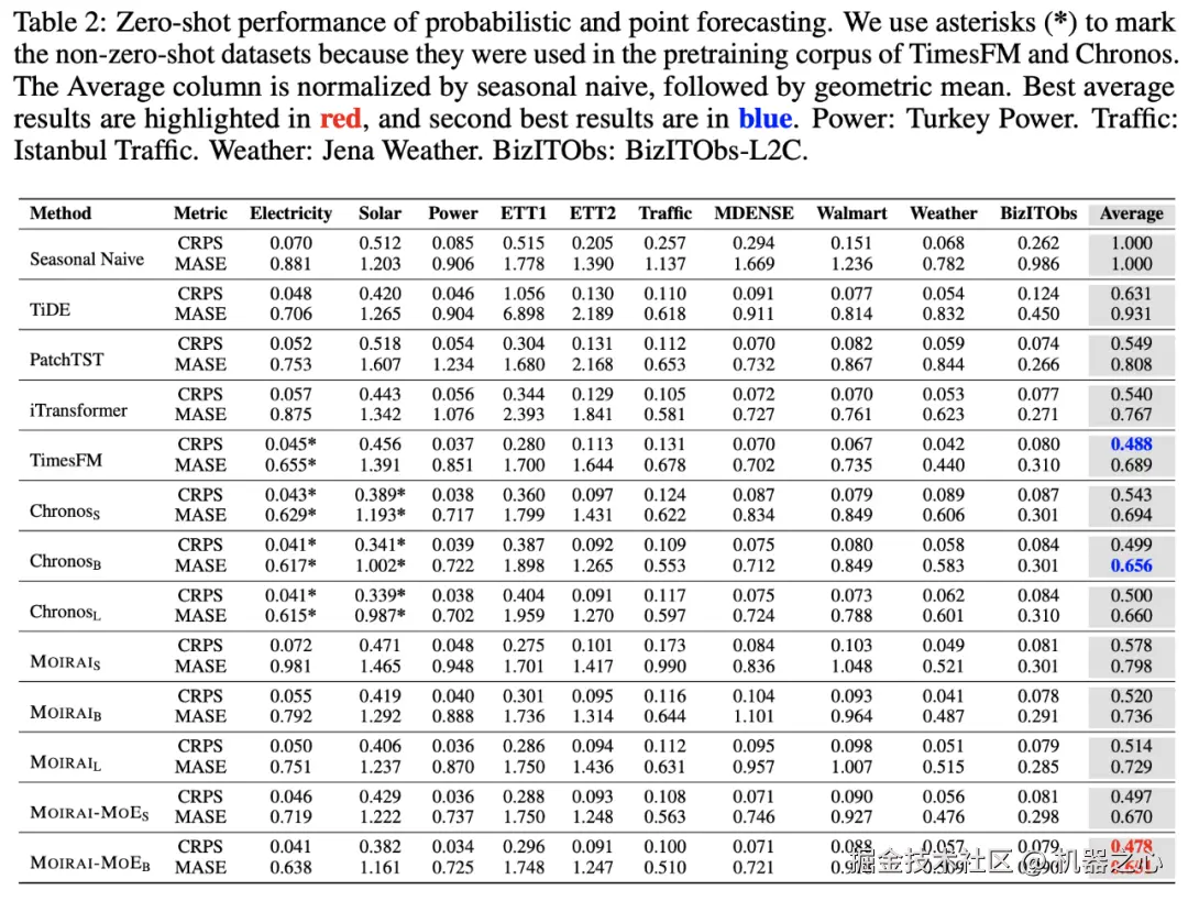 上表展示了在零样本预测设定时,Moirai-MoE 在 10 个数据集上的点预测和概率预测的表现。Moirai-MoE-Base 取得了最佳的零样本性能,甚至超越了 Google 的 TimesFM 和 Amazon 的 Chronos(他们在预训练语料库中已包含了部分评估数据,因此存在数据泄露)。与所有规模的 Moirai 相比,Moirai-MoE-Small 在 CRPS 方面提高了 3%-14%,在 MASE 方面提高了 8%-16%。考虑到 Moirai-MoE-Small 只有 11M 激活参数(比 Moirai-Large 少 28 倍),这些进步是非常显著的。