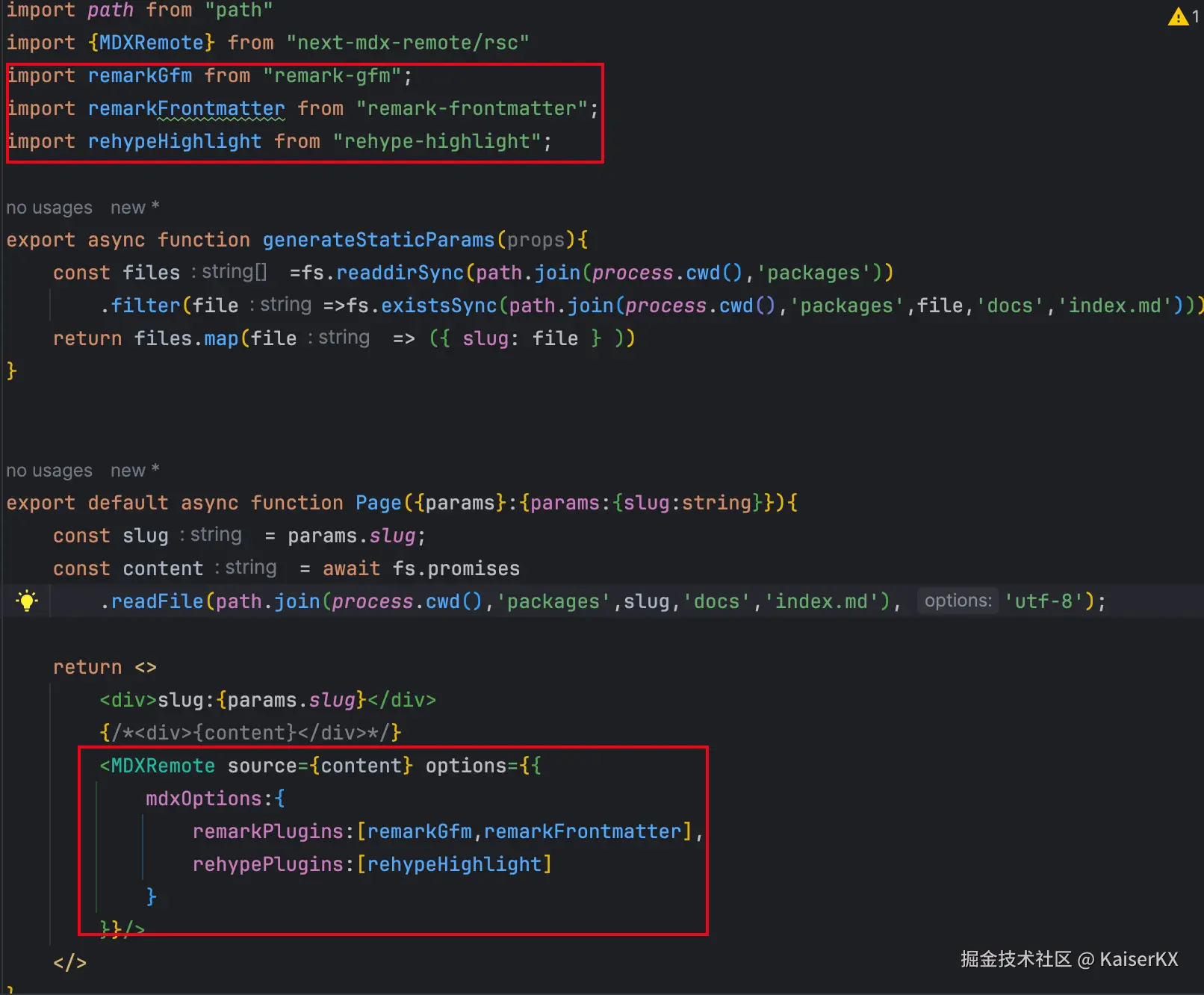 必须要强调的是:import 是从next-mdx-remote/rsc导入的MDXRemote,而不是直接从next-mdx-remote导入。虽然next-mdx-remote也可以导出MDXRemote组件,但是用法完全不同。具体异同笔者也不是很清楚,可以参考官方文档自行研究。