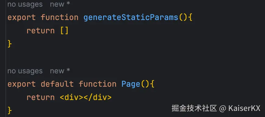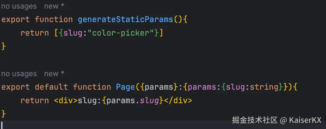 于是新建一个src/app/docs/[slug]/page.tsx页面文件,其除了页面渲染函数外,还有一个用于SSG指定构建路径的函数 generateStaticParams(),该函数在next.js以SSG构建时执行。详情参考官方文档。