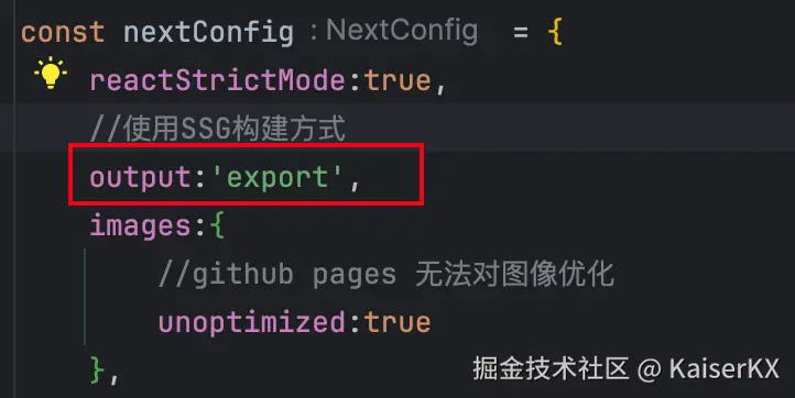 为了将我们的应用以SSG的方式构建,我们需要在next.config.js将output设置为 export。