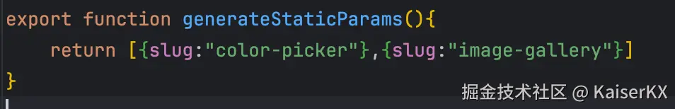 到了这一步,你可能对generateStaticParams()和动态路由[slug]有了一定的了解,其底层其实是一种**results.include([slug])**的匹配机制。而且,假若我们需要对packages/**下的每个组件库更新文档,每次都要来到这个src/app/docs/[slug]/page.tsx文件下,修改一下generateStaticParams()函数的返回值,你为了简化操作可能会有: