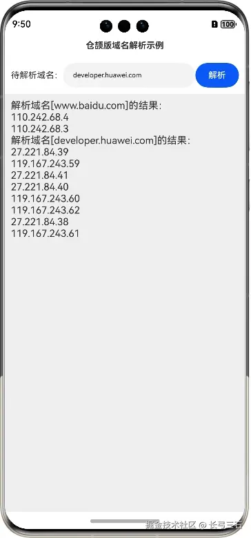 输入待解析的域名,然后单击“解析”按钮,即可进行解析,这里使用了百度和华为开发者社区的域名,解析结果如图所示: