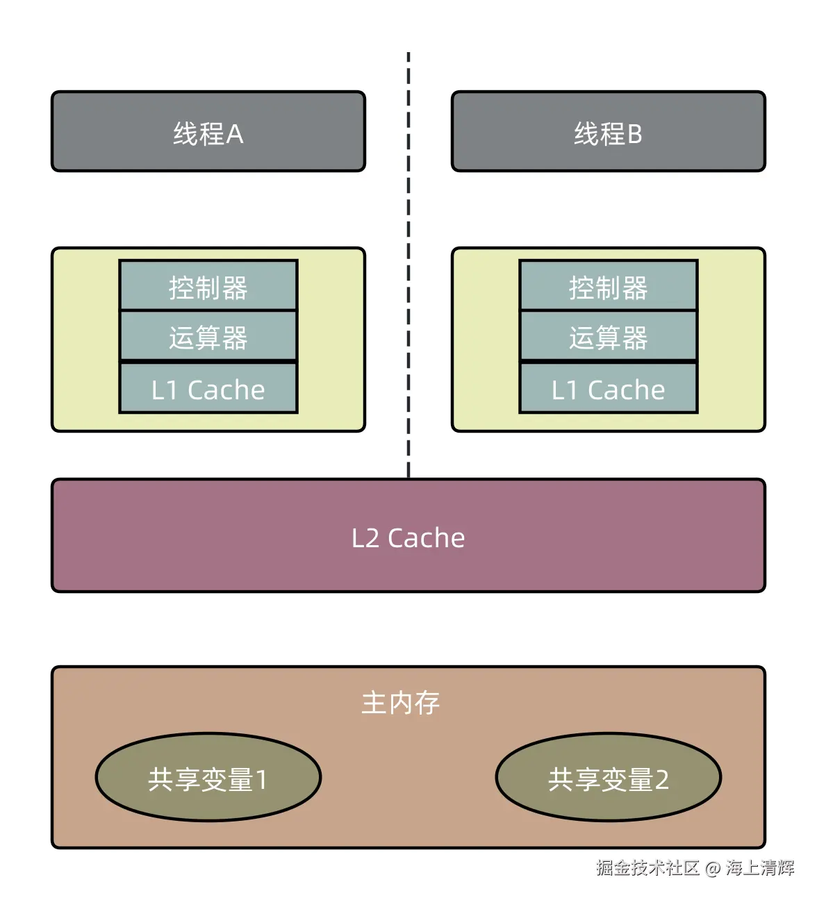 每个核的控制器,运算器还有L1缓存都是独立的,彼此不共享,而L2 Cache以及主内存是多核共享的。注意L2 Cache在部分CPU被设计为每个核心独有,不能共享,本篇我们是为了简化流程所以才说L2 Cache是多核共享的,大家千万不要认为所有CPU都是这样。