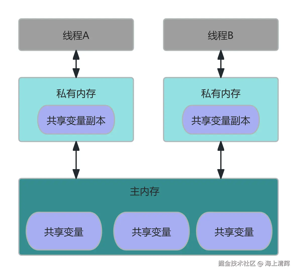 可以从上面的内存模型图上看出,在java中所有所有变量都放到主内存中,当线程使用变量时,会把变量从主内存复制到自己的私有内存空间或者叫工作内存,线程读写变量时操作的都是自己工作内存中的变量副本。