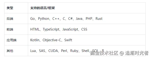 支持超过 100 种编程语言,如:Go、Python、C++、C、C#、Java、PHP、Rust等等。
