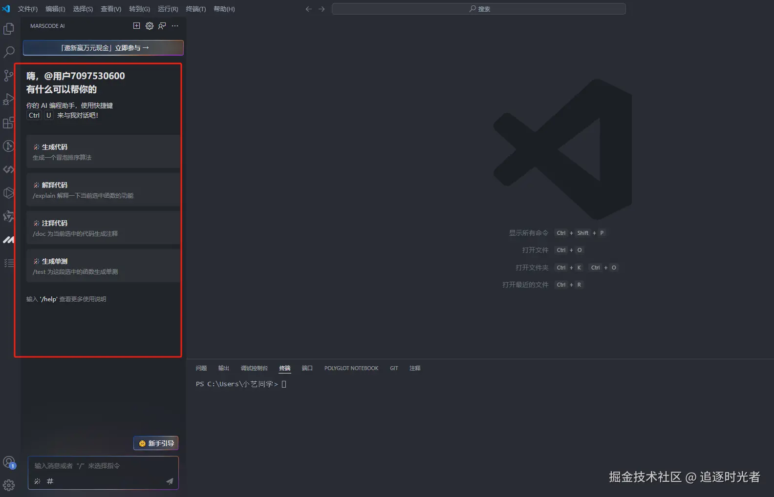 - 使用快捷键(Windows: Ctrl + U; macOS: Command + U)打开豆包 MarsCode 编程助手侧边对话框。