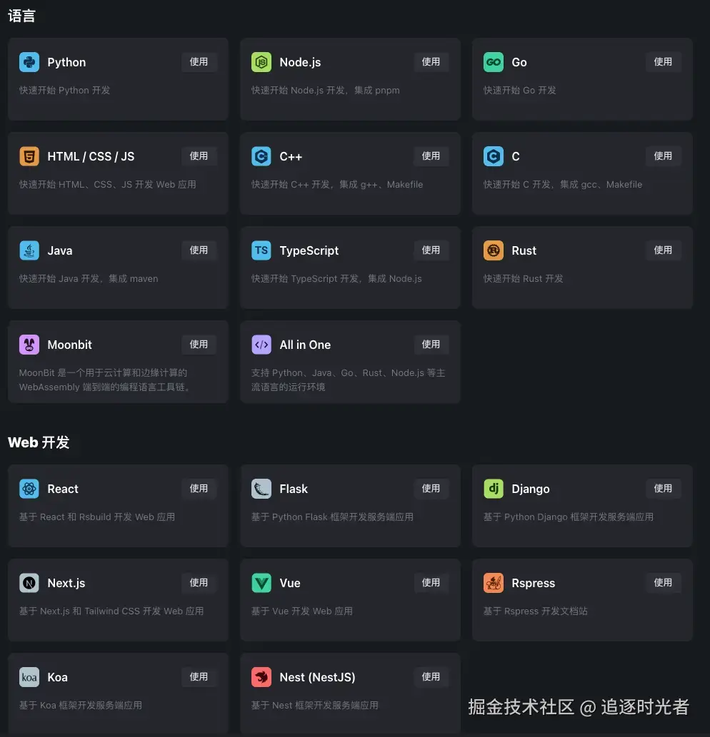 提供 C、C++、Go、JavaScript、Java、Node.js、Rust、TypeScript 等语言的开发环境和模板,避免繁琐的环境配置,让你将更多精力放在产品开发上。