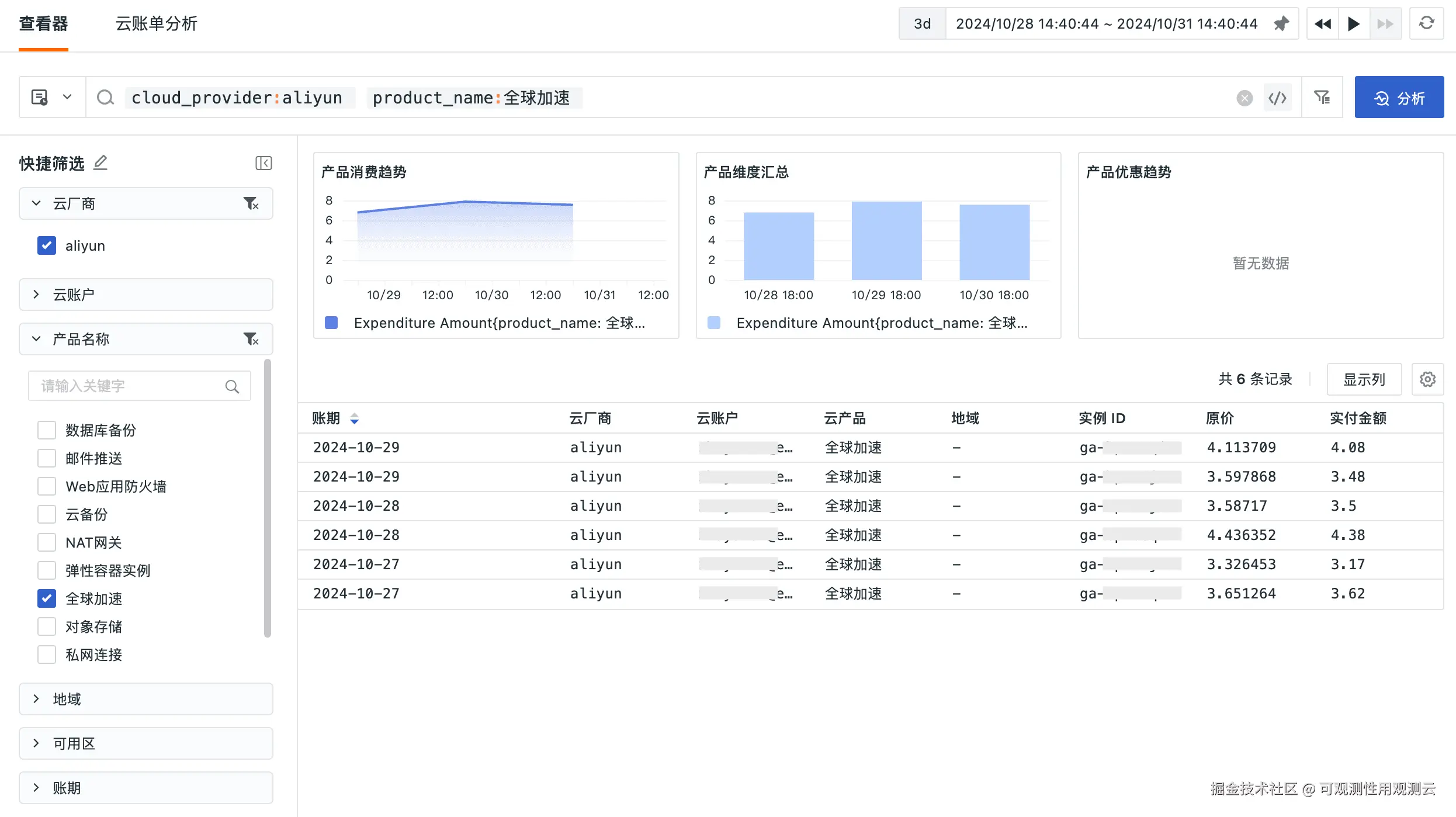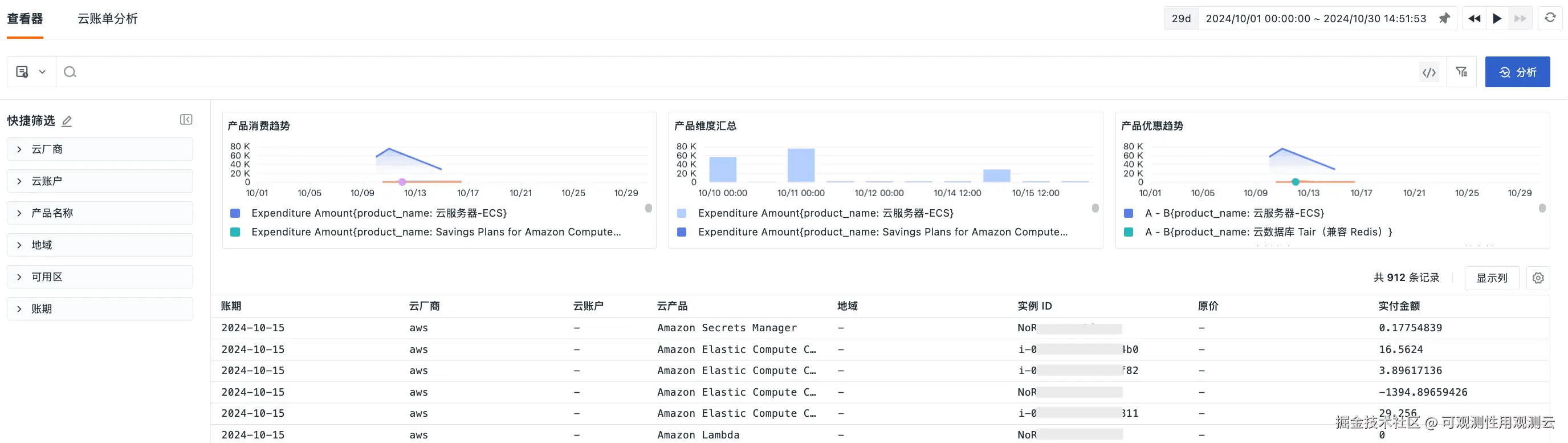 账单查看器还提供多维度筛选功能,用户可以按云服务提供商、账户、地区、可用区域等条件快速筛选账单。想查某个特定账号的费用,或者想看看在不同地区的资源消耗,只需几个筛选项就能一目了然。这节省了时间,抽丝剥茧复杂的账单信息,帮助企业更轻松掌握每一笔支出。