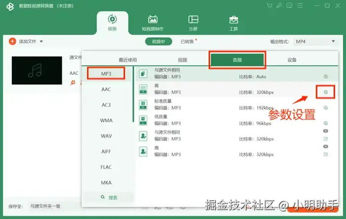 步骤4:点击【音频】,选择【MP3】格式。如果有需要的话,可以点击界面右侧的小齿轮图标进行【采样率】、【比特率】等参数设置。