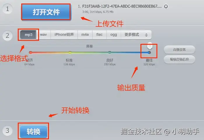 Online Audio Converter是一个简单易用的免费音频在线转换网站。它支持多种音频格式之间的转换,是一款不需要安装任何软件,适用于快速便捷转换需求的MP3转换器。下面是使用这个在线转换工具进行MP3格式转换的简易教程: