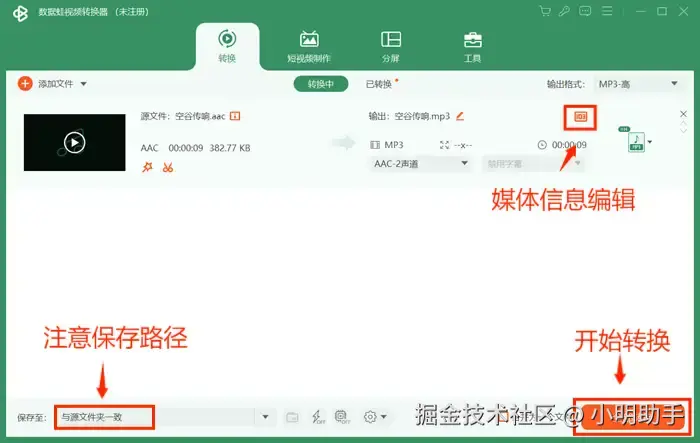 步骤4:还可以点击界面右侧橙色图标进行【媒体信息编辑】,添加音频文件封面等细节。然后点击左下角的方框,选择自己需要的保存路径。确认所有设置完成后点击【全部转换】按钮开始转换,数据 蛙视频转换器将迅速完成转换过程。