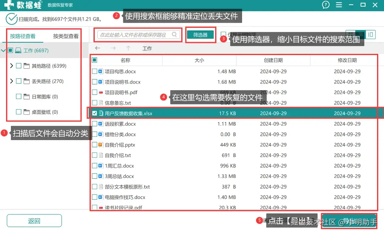 步骤2: 扫描结束后,在页面的右边进行扫描文件的选择,可以借助【搜索框】、【筛选器】等工具进行目标文件的勾选。勾选后点击文件,点击【导出】。
