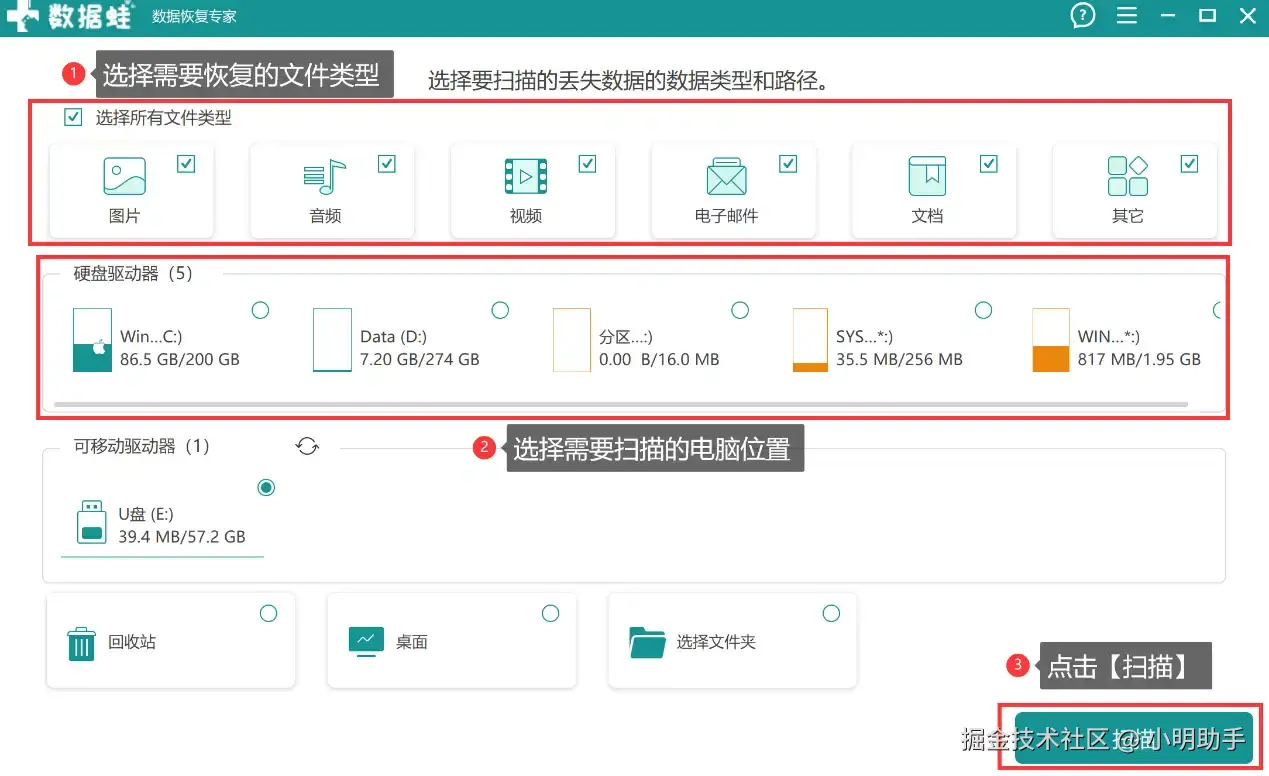 步骤1: 运行软件后在主页面选择好需要恢复的数据类型和需要进行扫描的位置(拖拽文件的原位置),然后点【扫描】。