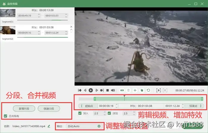 步骤3:录制好的游戏视频,进入【高级剪辑】可对视频进行分段、剪辑、增加特效等操作,同时我们也能修改输出的设置,让视频适合发布在各个平台上。