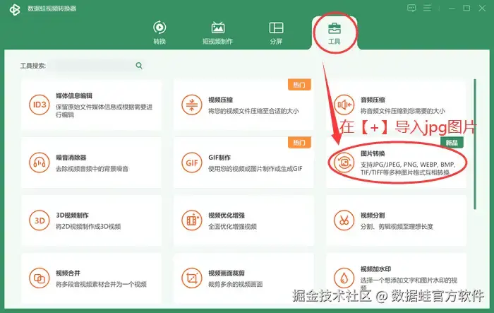第一步: 启动数据 蛙,点进 【工具】→【图片转换】→【+】 按钮,上传需要压缩的jpg文件。