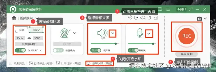 步骤2: 可以自由选择录制区域,选择录制音频来源,开启或关闭水印,还可以点击扬声器或者麦克风旁的三角符号对录制音频的音量、延迟、降噪进行设置。设置完毕后就可以点击 “REC” 进行录制了。