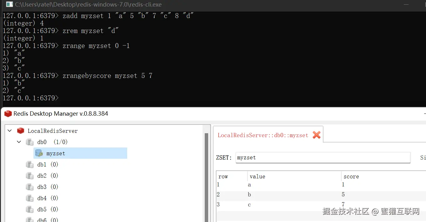 zadd myzset 1 "a" 5 "b" 7 "c" 8 "d"