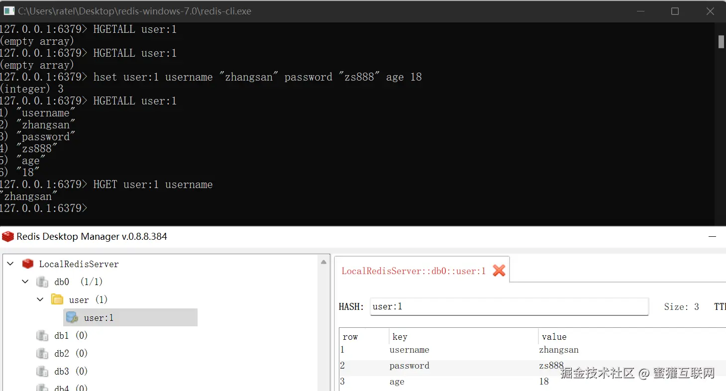 - HSET 命令不区分插入和更新操作,这意味着修改数据时不用事先判断字段是否存在来决定要执行的是插入还是更新操作。