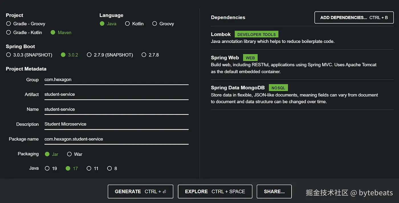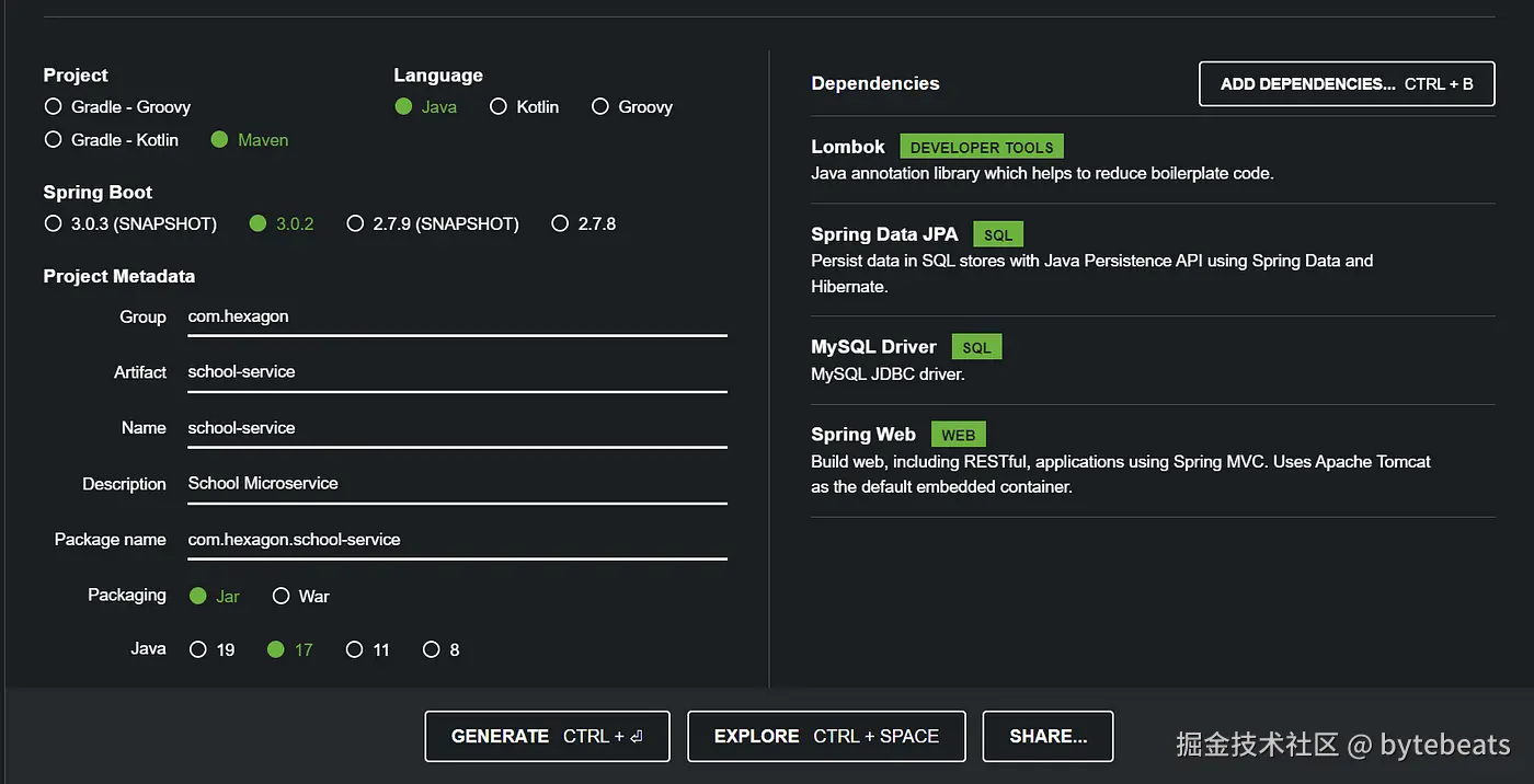 要初始化项目, 请访问 start.spring.io/, 你可以根据需要指定自己的Groud Id, Artifact Id, Project Name和Java Version. 我们还将在这里添加一些依赖项, 因为我们希望在项目中使用它们: 目前, 我需要Lombok, Spring Data JPA, Spring Web和MySQL Driver作为依赖项.