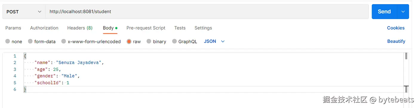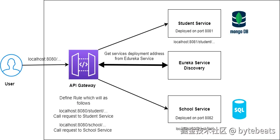 正如你所看到的, 在这个例子中, 我们有 Student 微服务和 School 微服务. 为了演示的目的, Student 服务使用名为 MongoDB 的 NoSQL 数据库, School 服务使用 SQL 数据库.