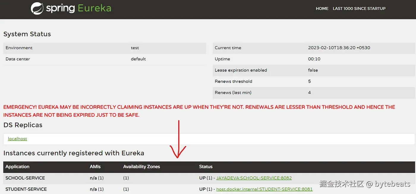目前你看不到任何在服务器上注册的应用. 因此, 在更改应用属性后, 你必须重启 Student 和 School 服务, 然后再次刷新浏览器. 然后, 你就可以在当前已在 Eureka 注册的实例下看到 STUDENT-SERVICE 和 SCHOOL-SERVICE.