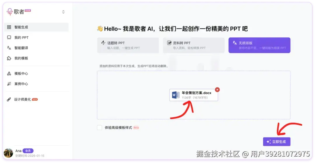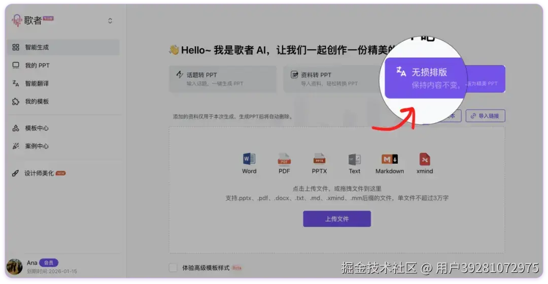 **很多时候,我们手中已经有了内容非常完备的文档,不需要 AI 帮忙生成额外的新内容,只希望能迅速将这些内容排版成精美的 PPT ···**如果你有这样的想法,那么歌者 PPT 的「AI 无损排版」功能就是你的最佳选择!