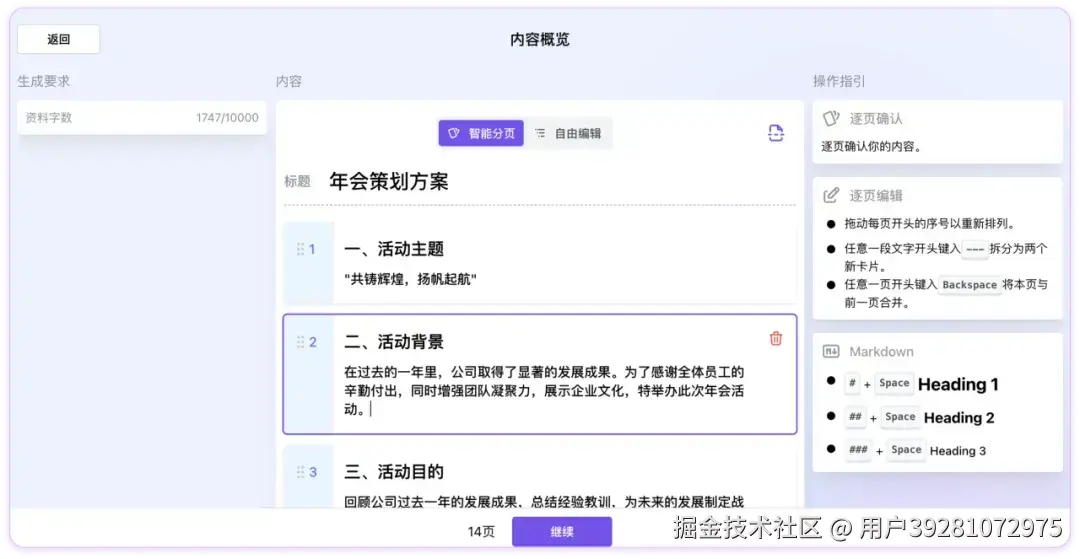 3. 进入内容概览页,在这里你可以调整分页和确认内容,点击「继续」等待排版完成