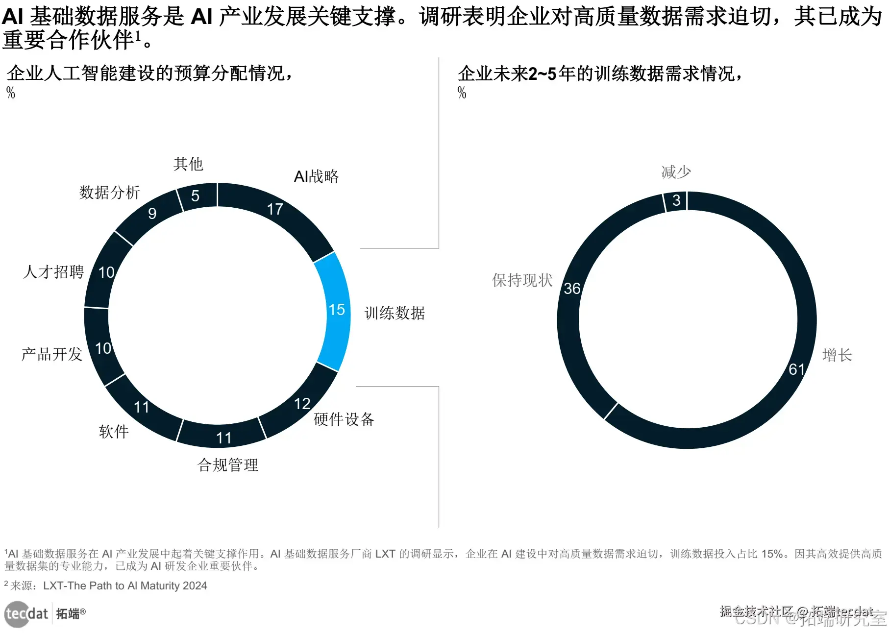 AI 基础数据服务是关键支撑。调研2024年数据和AI趋势显示企业对高质量数据需求迫切,其已成 AI 研发企业重要伙伴。