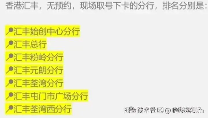 网络流传无预约情况下,可现场取号下卡的汇丰分行(未证实)