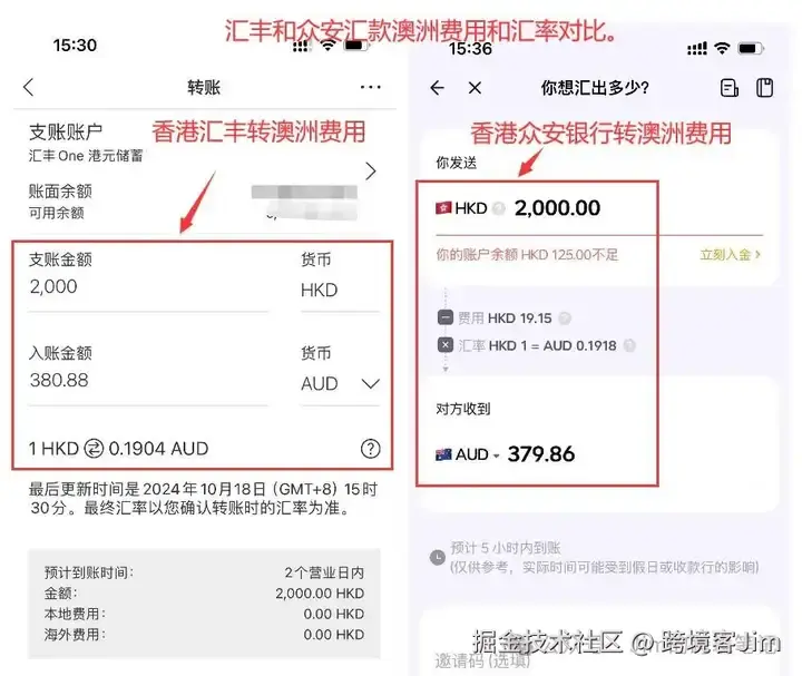根据计算得知,同样汇款2000港币到澳洲银行,在众安银行收费19.15港币手续费的情况下,汇丰银行最终到账才比众安银行多1澳币(约5港币)。