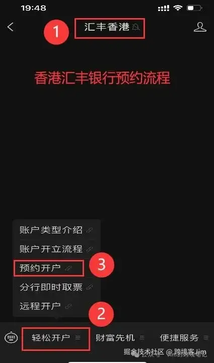 四、香港汇丰银行 - 开户流程 通过上面两个例子,说明虽说汇丰有想全球免费转账的功能,但是汇率着实不敢恭维,不过作为香港排第一的外资银行,还是要务必拿下的,本节就来说说具体的开户流程。 汇丰银行开户需要提前预约(公众号),需要有一定的投资经验。