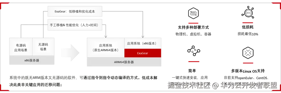 快速扫描海量代码,提供专业迁移指导报告,自动分析出需修改的代码内容,给出修改建议;无源码应用基于ExaGear动态二进制翻译工具,低成本解决应用的平滑迁移,释放鲲鹏平台澎湃算力。