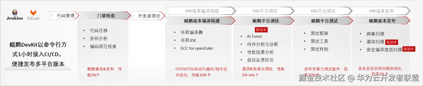 - 基于鲲鹏硬件+openEuler+鲲鹏DevKit +鲲鹏BoostKit构建1套软件工程流水线,实现1套代码开发、多平台运行,助力伙伴持续且首发性能领先的鲲鹏商用版本
