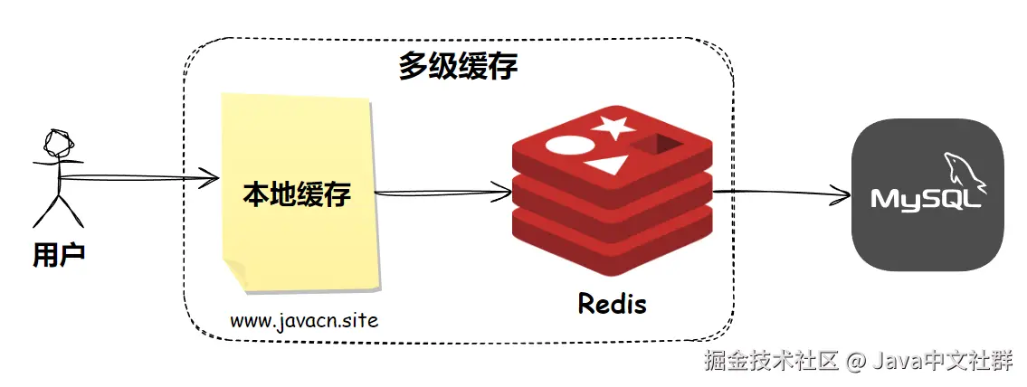 多级缓存是一种缓存架构策略,它使用多个层次的缓存来存储数据,以提高数据访问速度和系统性能,最简单的多级缓存就是由本地缓存 + Redis 分布式缓存组成的,如图所示: