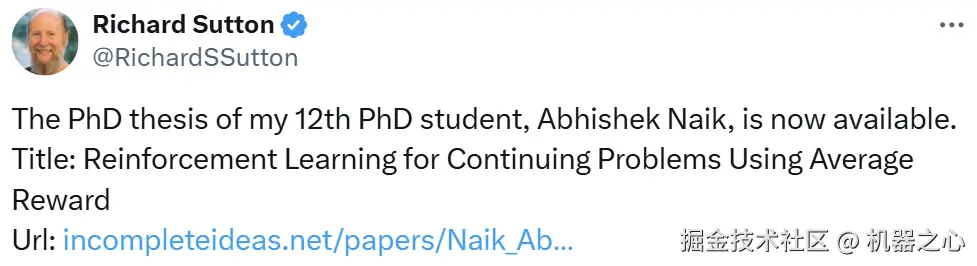 该论文是首届强化学习会议(RLC 2024)的入选论文之一。一作 Abhishek Naik 刚刚从阿尔伯塔大学获得博士学位,他是 Sutton 教授的第 12 位博士毕业生。