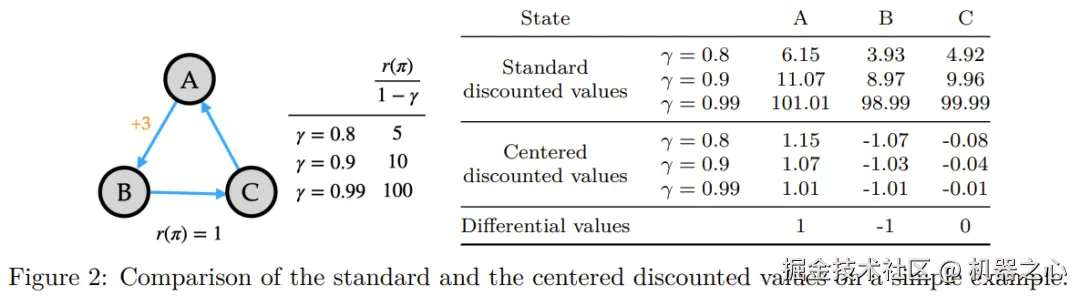 在完整的强化学习问题中,与状态无关的偏移可能会相当大。举个例子,图 2 中展示的三状态马尔科夫奖励过程。如果状态从 A 变成 B,则奖励是 +3,否则都是 0。平均奖励为 r(π) = 1。右侧表中给出了三个折现因子的折现状态值。