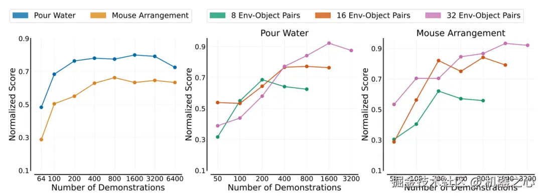 - 单个物体的演示数据很容易达到饱和 —— 在倒水和摆放鼠标等任务中,总演示数据达到 800 次时,性能就开始趋于稳定。因此,每个物体 50 次示范基本就能搞定。