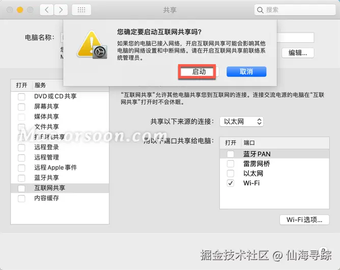 6、如果您确定要启动互联网共享,请点按“启动”。否则,请点按“取消”。