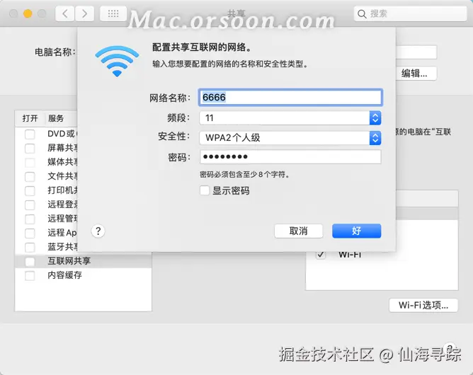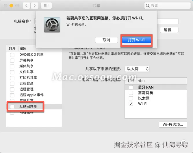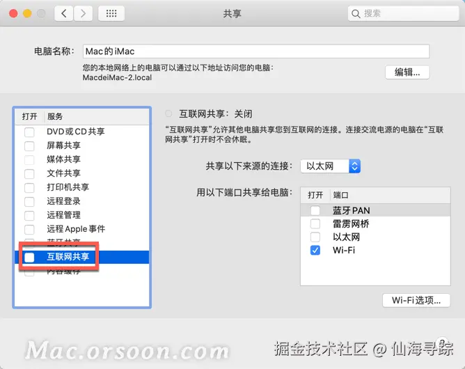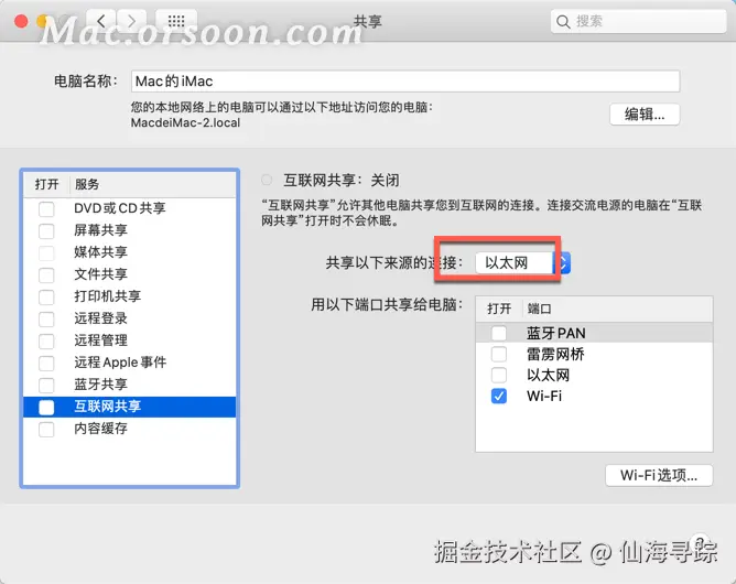 为还不知道如何进行网络共享设置的朋友们带来这篇教程,这篇文章将会为大家介绍如何设置与其他网络用户共享 Mac 上的互联网连接,也就是开启Mac电脑的Wi-Fi热点,大家可以与本地网络上的其他电脑共享 Mac 上的互联网连接。例如,如果您的 Mac 使用以太网接入互联网,您可以通过 Wi-Fi 将该连接共享给其他电脑。