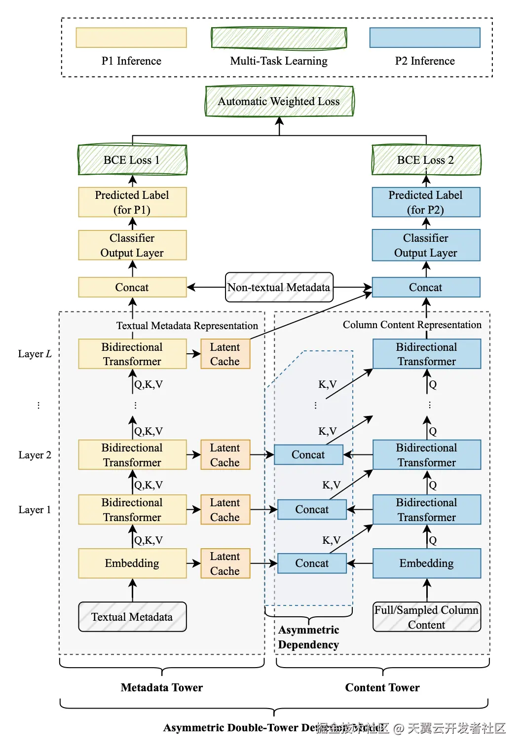 此外,该论文进一步设计了一种新颖的非对称双塔检测模型(Asymmetric Double-Tower Detection,简称ADTD),通过引入多任务学习来支持Taste的两阶段检测过程。ADTD模型结构分为Metadata塔和Content塔(如图2所示),前者是对元数据特征进行编码,后者是结合元数据信息对列内容特征进行编码。在Taste的两阶段检测中,第一阶段仅利用Metadata塔进行推理,并将Metadata塔加入到缓存中,供第二阶段使用,以减少重复推理;第二阶段则是结合Metadata塔的缓存和Content塔进行推理。在训练过程中,两个阶段的输出可以结合在一起做多任务学习,使得模型只需训练一次,即可应用于两个阶段的推理过程。