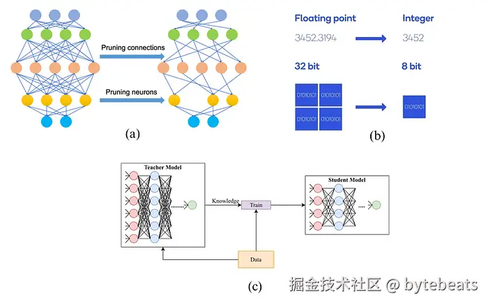 模型压缩方法:(a) 剪枝, (b) 量化, (c) 知识提炼