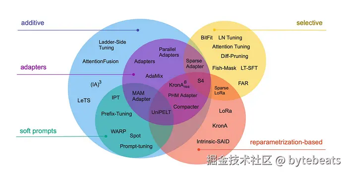 近年来微调方法的演变发展. 同一分支上的模型具有一些共同特征. 模型的垂直位置显示了其发布日期的时间轴.