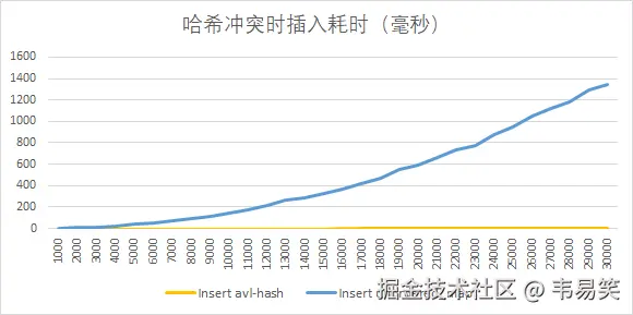 可以看出搜索对比,横轴表示冲突节点数量,纵轴表示测试耗时,可以看出随着碰撞的增加,树表混合结构的查询时间基本只是从 0毫秒增加到了 1-2毫秒,而 unordered_map 的搜索时间却是抛物线上升到1.4秒了。