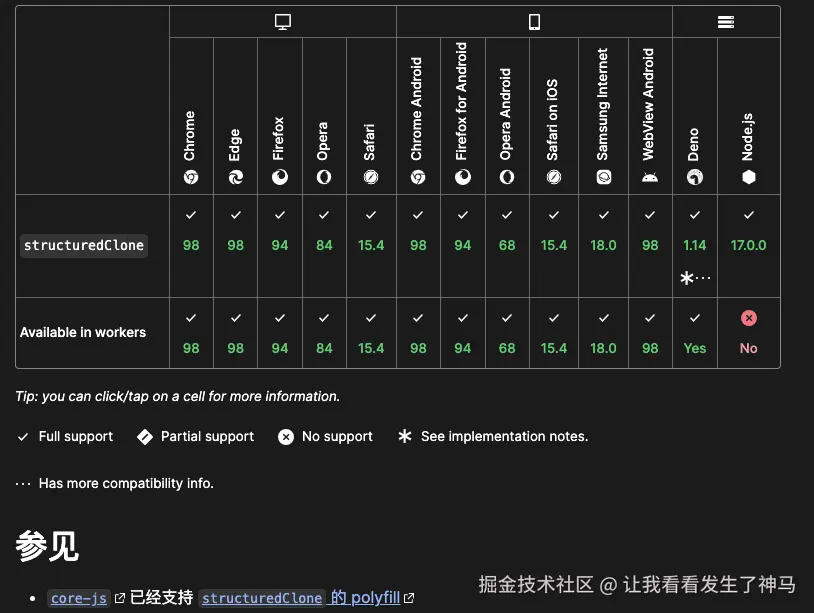 - 上述两种深拷贝的方式都有一些缺点,因此在学习上述深拷贝方式的时候,你可能就想过,浏览器为啥不支持原生的深拷贝呢?这不 structuredClone 就来啦~浏览器运行时原生支持的深拷贝 API