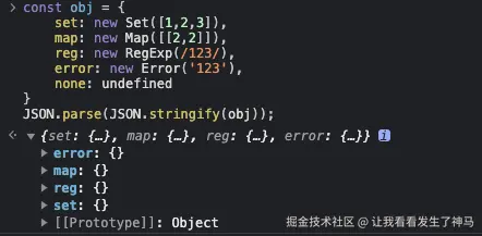 3、如果你的 obj 对象中存在 Set、Map、正则、Error 对象,该方法会将其转成空对象字面量 { } ,如果存在 undefined,该方法会直接忽略