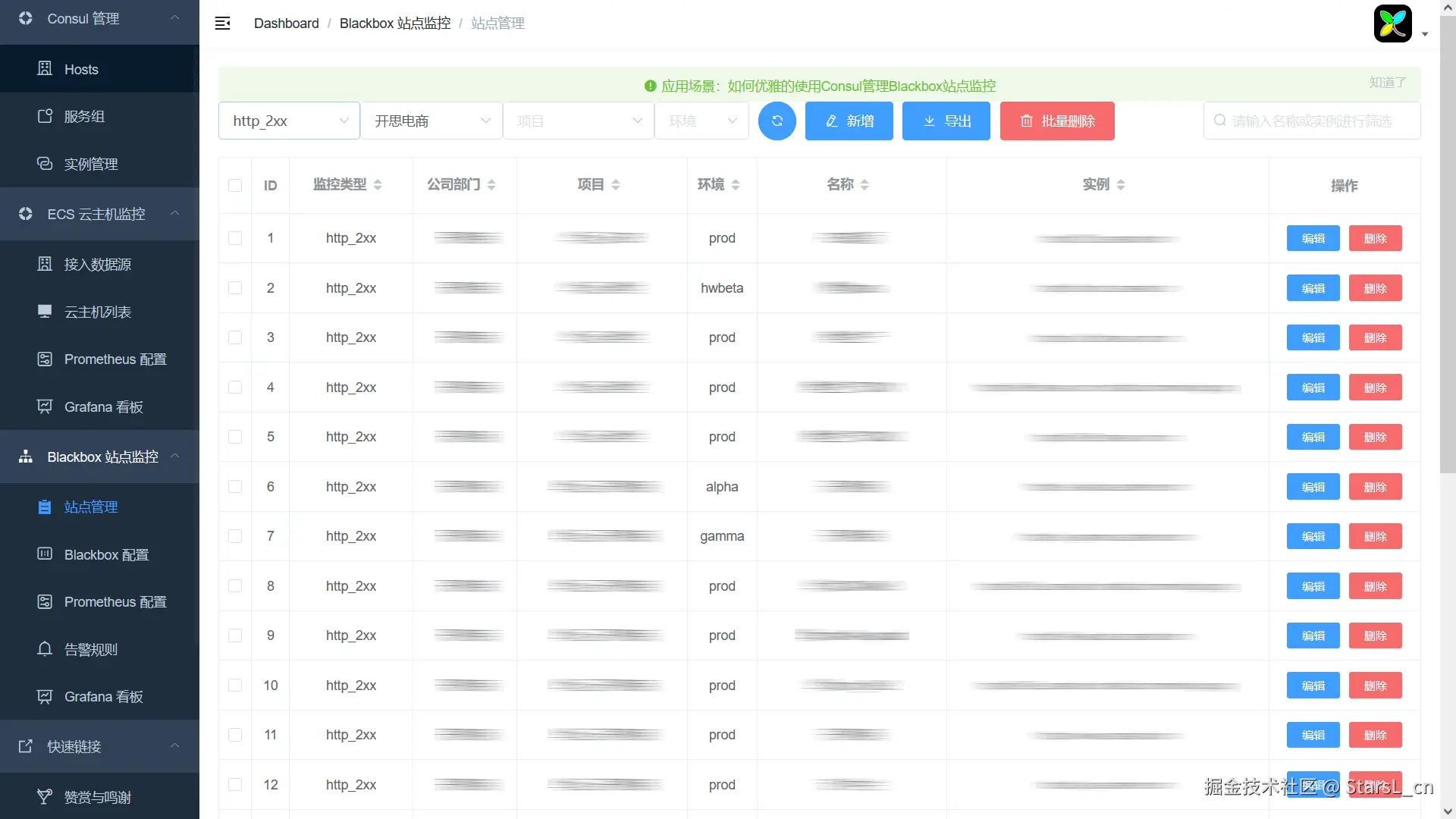 - 支持对监控目标的批量删除与批量导入,数据实时同步到Consul。