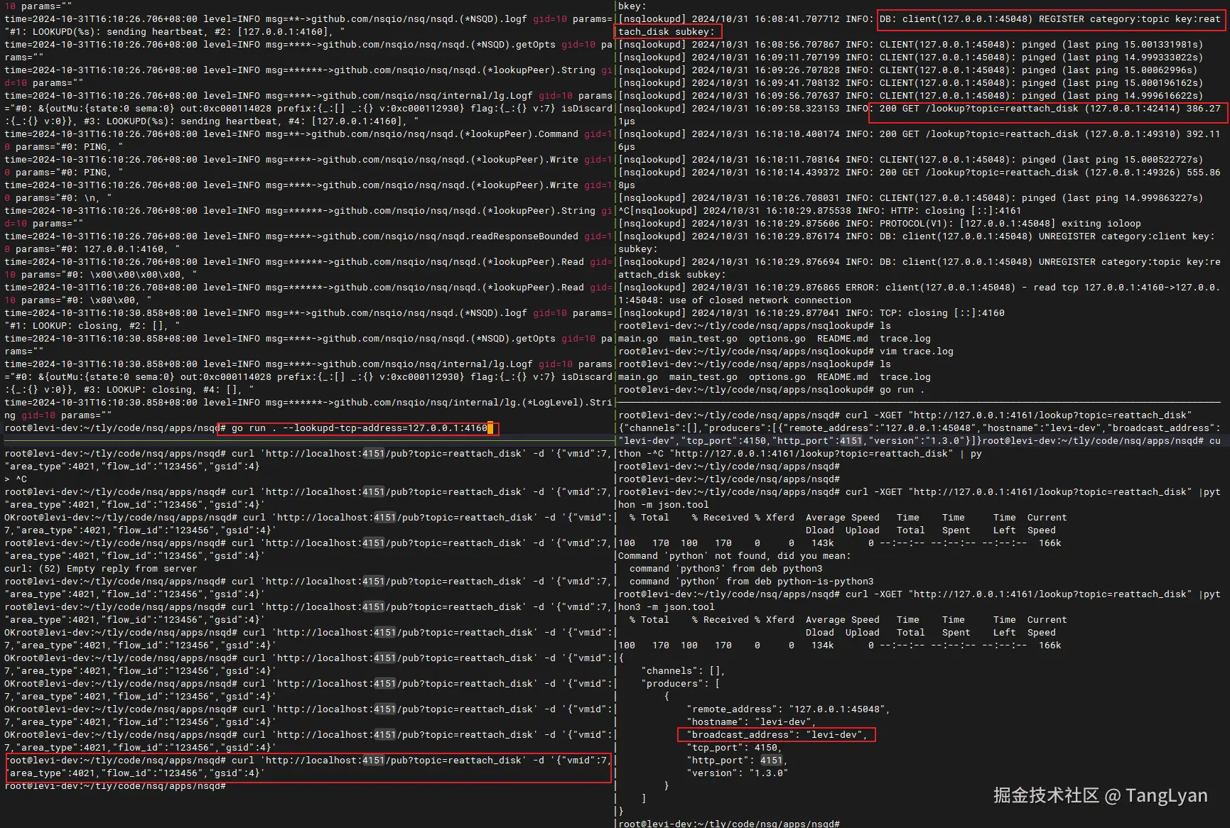 通过tmux打开四分屏模式可以看到,启动程序后续后,向nsq topic发送消息,会触发nsqd向lookupd注册topic以及nsqd的信息;