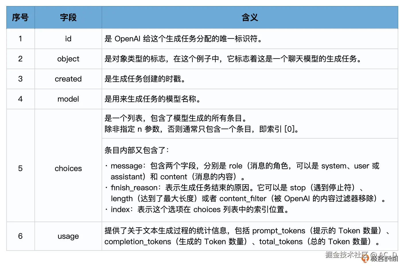 当你调用OpenAI的Completion.create方法时,它会返回一个响应对象,该对象包含了模型生成的输出和其他一些信息。这个响应对象是一个字典结构,包含了多个字段。