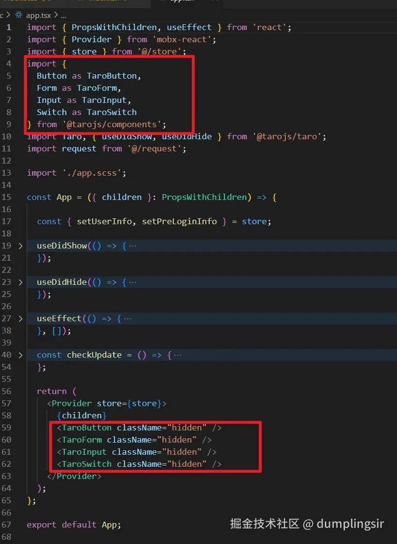 记录Taro + nutUI开发小程序时"./base.wxml:Template `tmpl_0_13` not found"错误的解决办法。 dumplingsir 2024-11-03 663 阅读1分钟 错误内容如下图: 问题原因可是`nutUI`中与`Taro`原生提供的组件同名导致的,猜测是这个原因,官方仓库的issues中也没看到有这样的问题,这样的组件`Button`,在`nutui`和`taro`中组件名是一样的 解决办法: 将原生的组件也放到页面中,可以理解为让他占个位,然后`nutui`的组件就能正确处理了。可以放在app.tsx中,如下图: