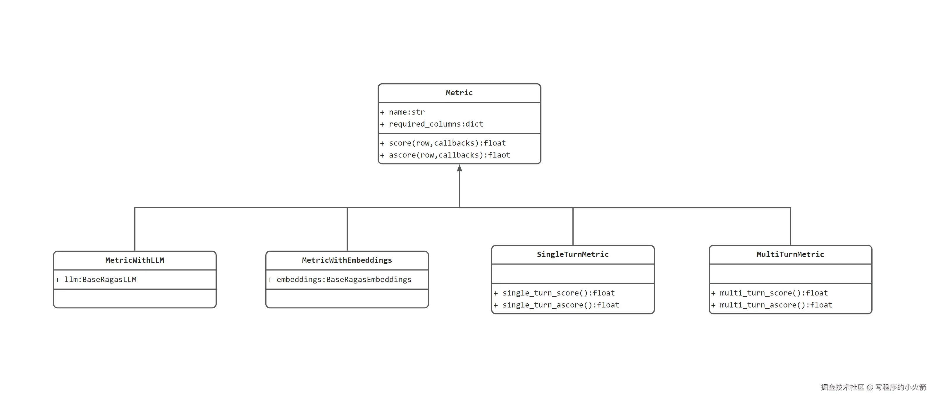 在开始走读代码之前,先就RAGas中的metric类代码继承关系做下简要的说明。所有的指标类都都继承自Metric这个基类,其中必选name、required_cloums两个属性,分别代表指标名和评测该指标所必须的数据列。有四个类继承自Metric,分别是